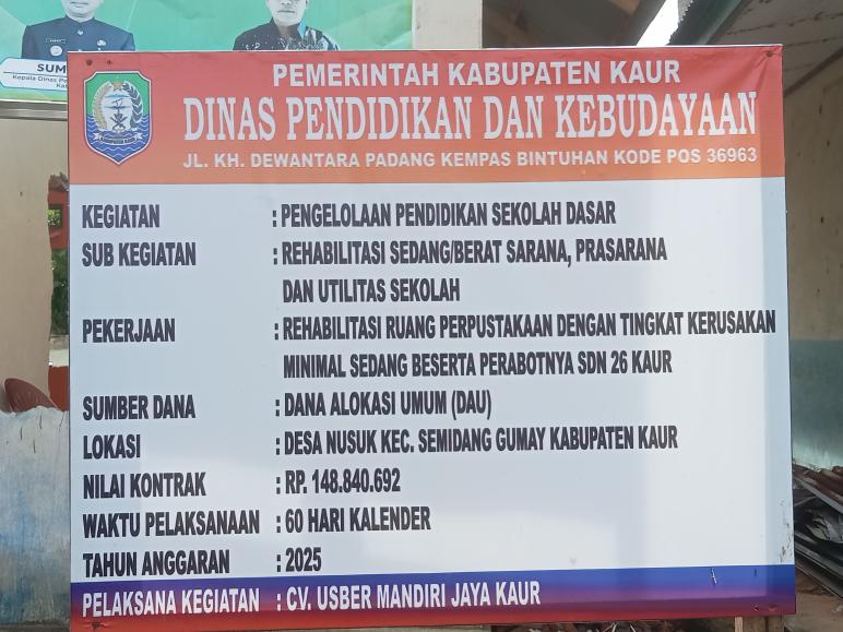 KAUR BENGKULU, II INDOKU.ID โPekerja proyek pengelolaan Sekolah Dasar (SD) Negeri 26 Kaur ini tanpa di lengkapi K3 , Pengerjaan proyek Dana Alokasi Umum (DAU) Tahun Anggaran 2025, dengan nilai anggaran Rp 148.840.692, dikerjakan oleh CV. Usber Mandiri Jaya Kaur, dengan waktu 60 hari kerja kalender.