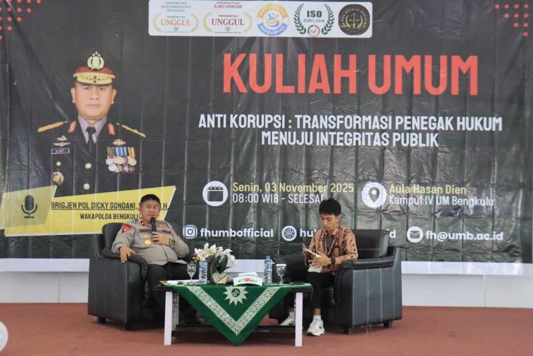 BENGKULU, II INDOKU.ID ~Wakapolda Bengkulu, Brigjen Pol. Dicky Sondani S.I.K., M.H., menjadi narasumber dalam Kuliah Umum dengan tema "Anti Korupsi: Transformasi Penegak Hukum Menuju Integritas Publik" di Universitas Muhammadiyah Bengkulu (UMB) pada Senin, 3 November 2025. Kegiatan ini dilaksanakan dalam rangka Dies Natalis Fakultas Hukum UMB ke-17 Tahun 2025.